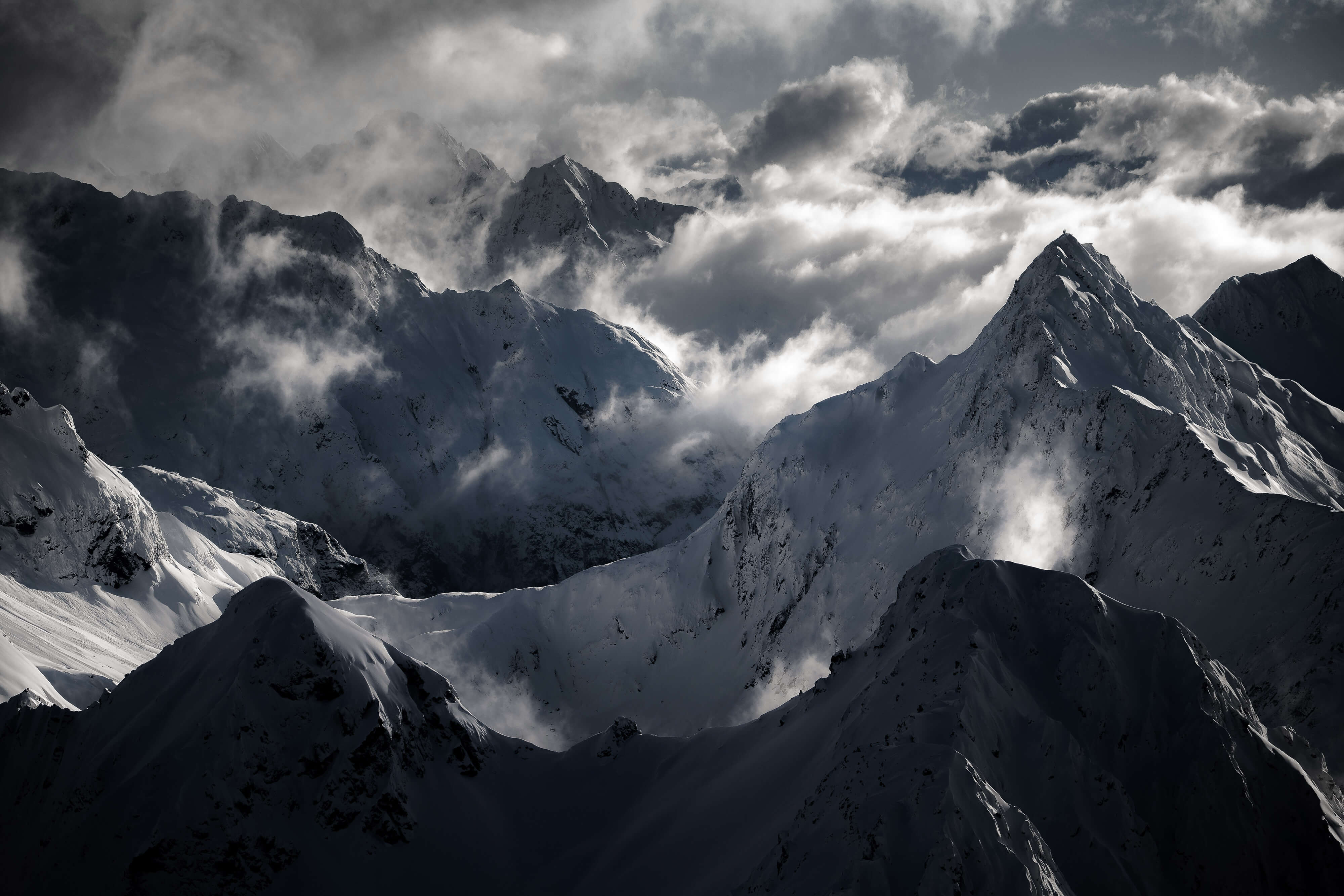 Violent winds and signs of an impending storm rip fresh snow off a 3000 peak in the Southern Alps of New Zealand. Sometimes adverse weather conditions provide the most interesting atmosphere but you just have to be able to weather the immense turbulence to be able to capture scenes such as this.
