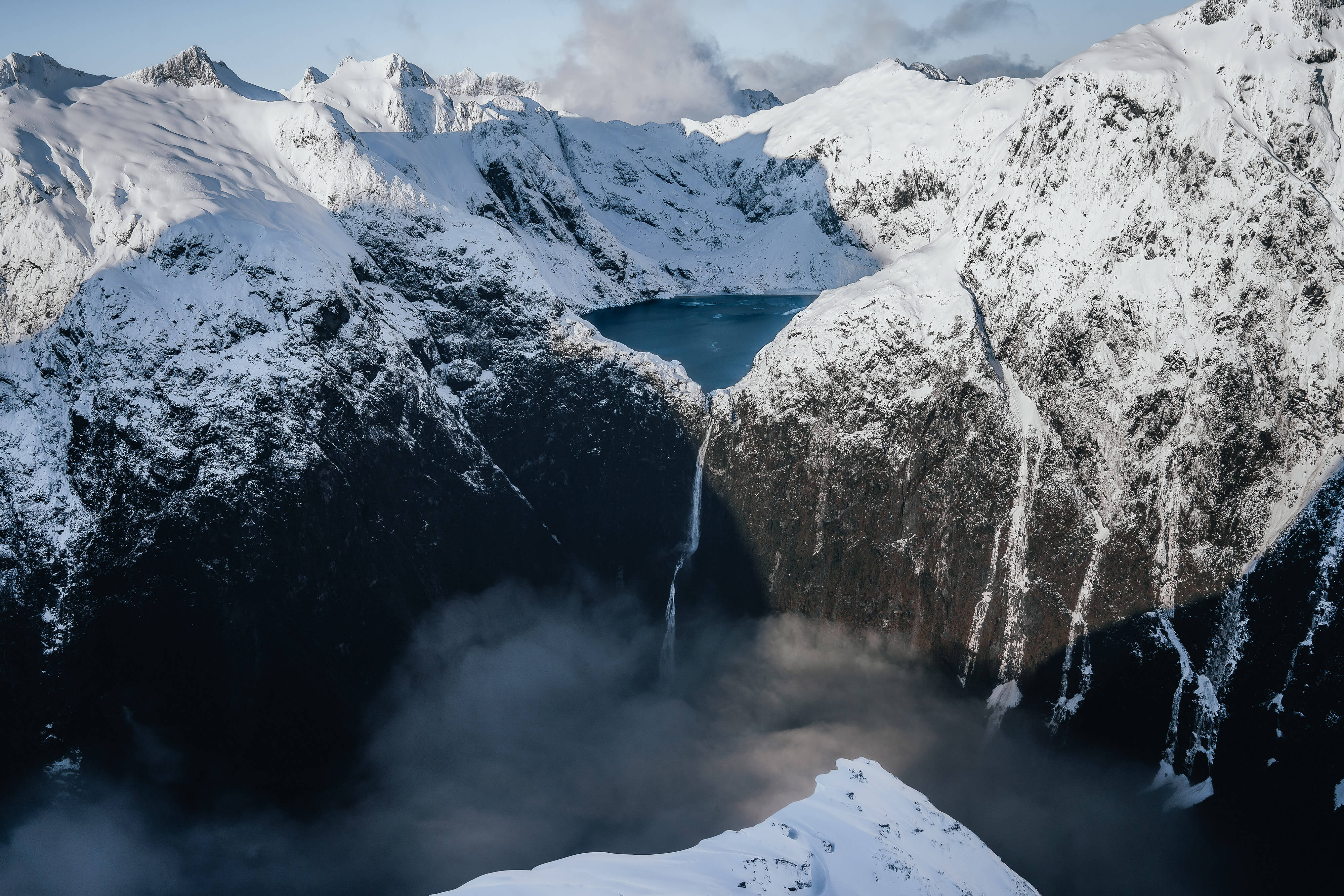 Low cloud and fresh snow framing New Zealand’s tallest waterfall, Sutherland Falls, located deep in a glacier-carved valley inside the untouched wilderness of Fiordland.