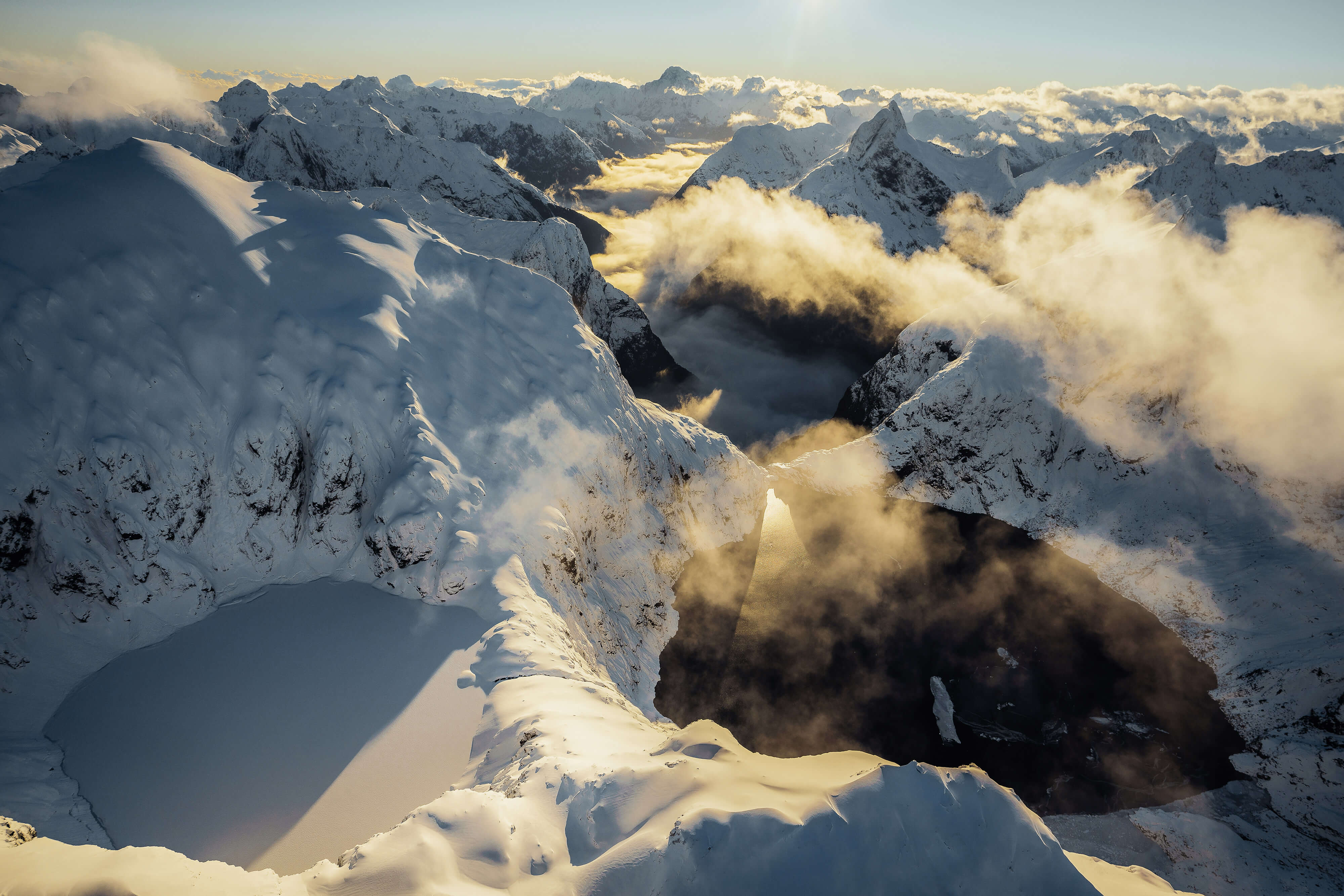 The hanging glacier lakes of Fiordland laying at the end of the Arthur Valley dominated Fiordland’s tallest peaks, Mount Tutoko and Mount Madeline, in the distance. Most images of this location are seen from the front showcasing the huge waterfall flowing from the lower lake but on this occasion, with the right weather conditions, we intended to fly behind the lakes and capture the entire scene angling the plane to line up the lakes, valley and the rugged mountains.