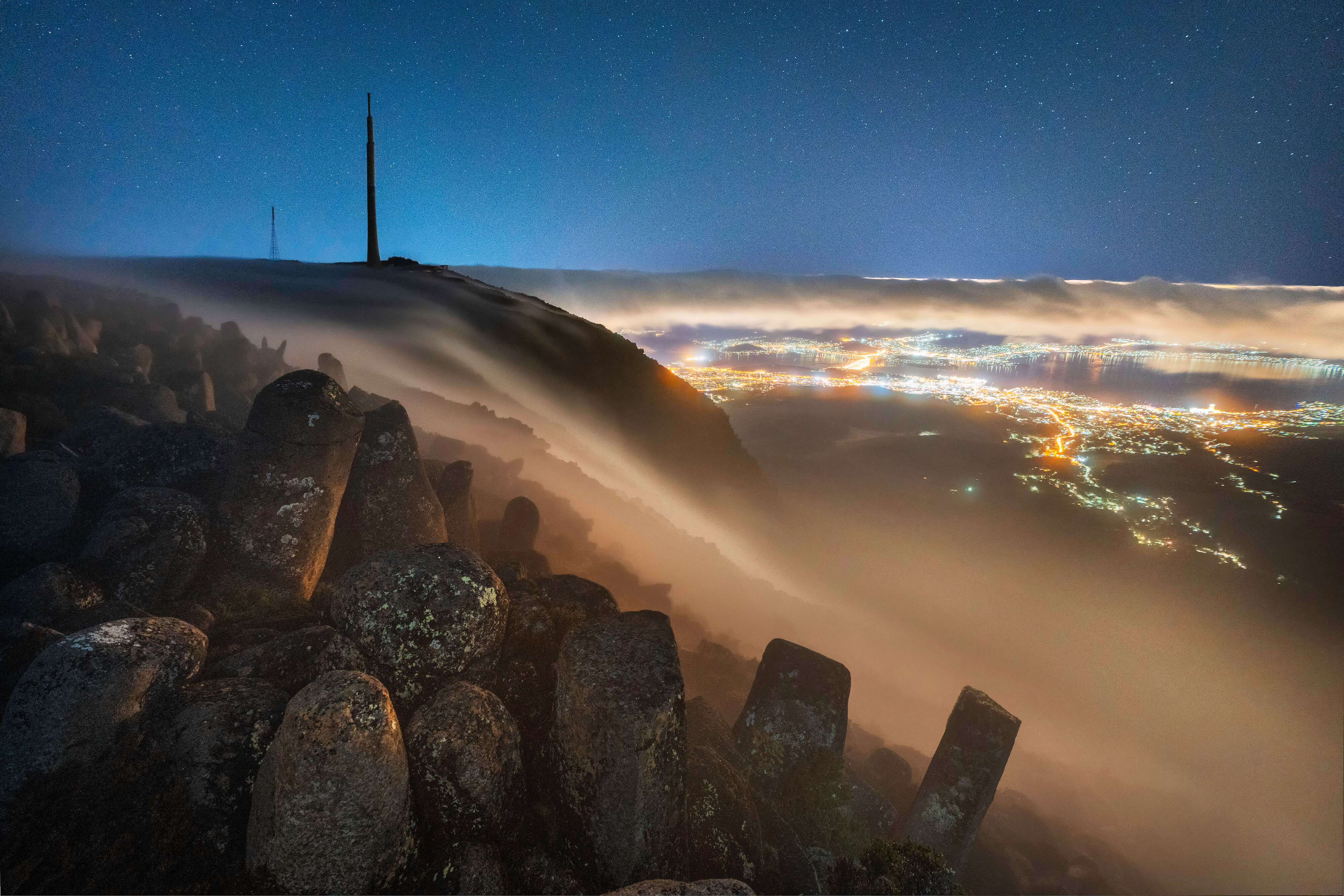 What started out as a foggy evening on the summit of Kunanyi/Mount Wellington transformed into an incredible scene. As the fog cleared it started falling down the side of the mountain like a waterfall, the lights of Hobart city glowing in the distance.